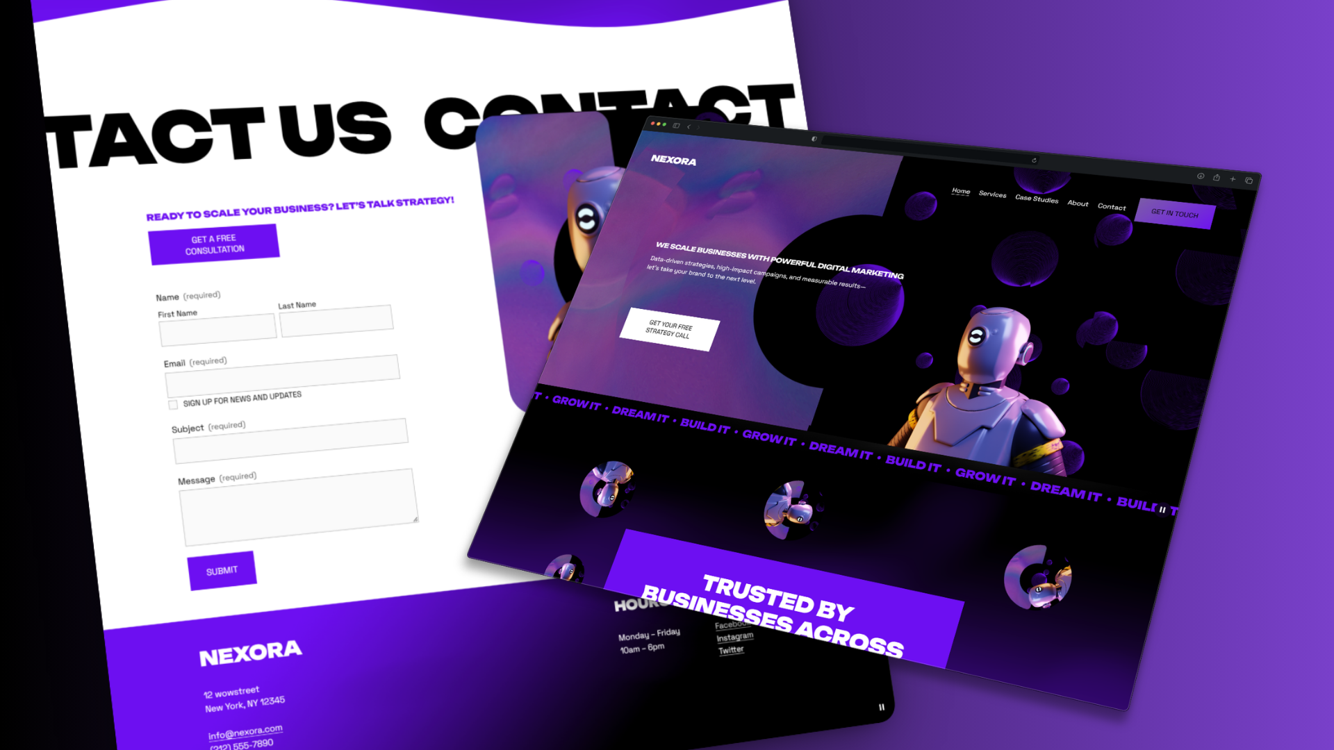 Nexora is a bold and innovative marketing agency that helps brands grow through cutting-edge digital strategies. Their vision is to be the go-to partner for businesses looking to scale with creativity, data, and impact. They needed a website that matched that energy—professional, striking, and built for conversions.